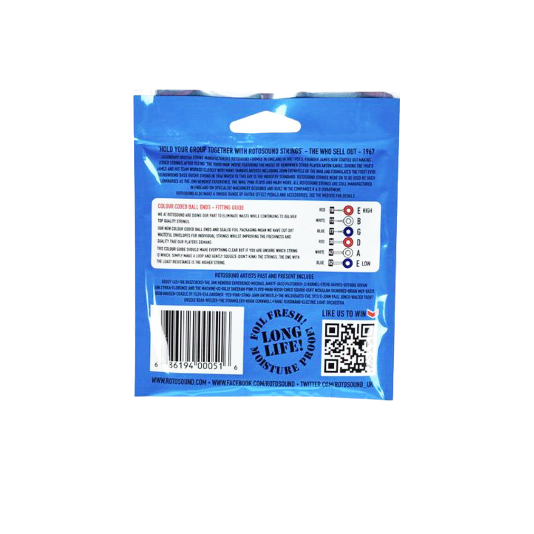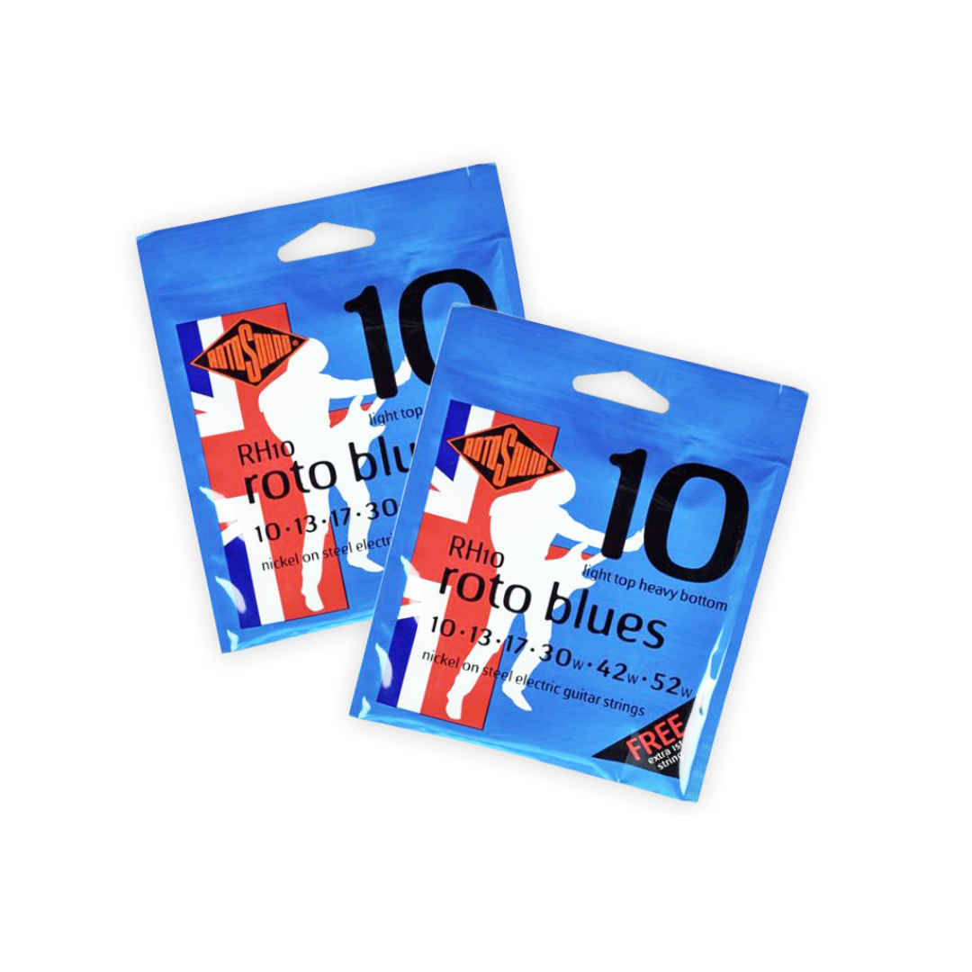 These are Rotosound RH10 Roto Blues nickel wound over steel electric guitar strings. Developed in conjunction with some of the worlds top artists, these unique strings deliver a smooth powerful tone that lasts while other strings have long gone dead. Superb brilliance and strength make Roto's the first choice for the professional.