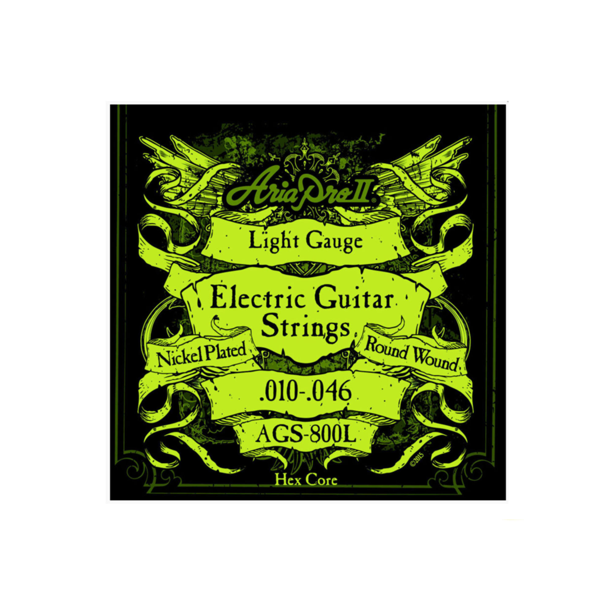 Aria Pro II electric guitar strings are made from nickel plated steel wire wrapped around a hexagonal core.