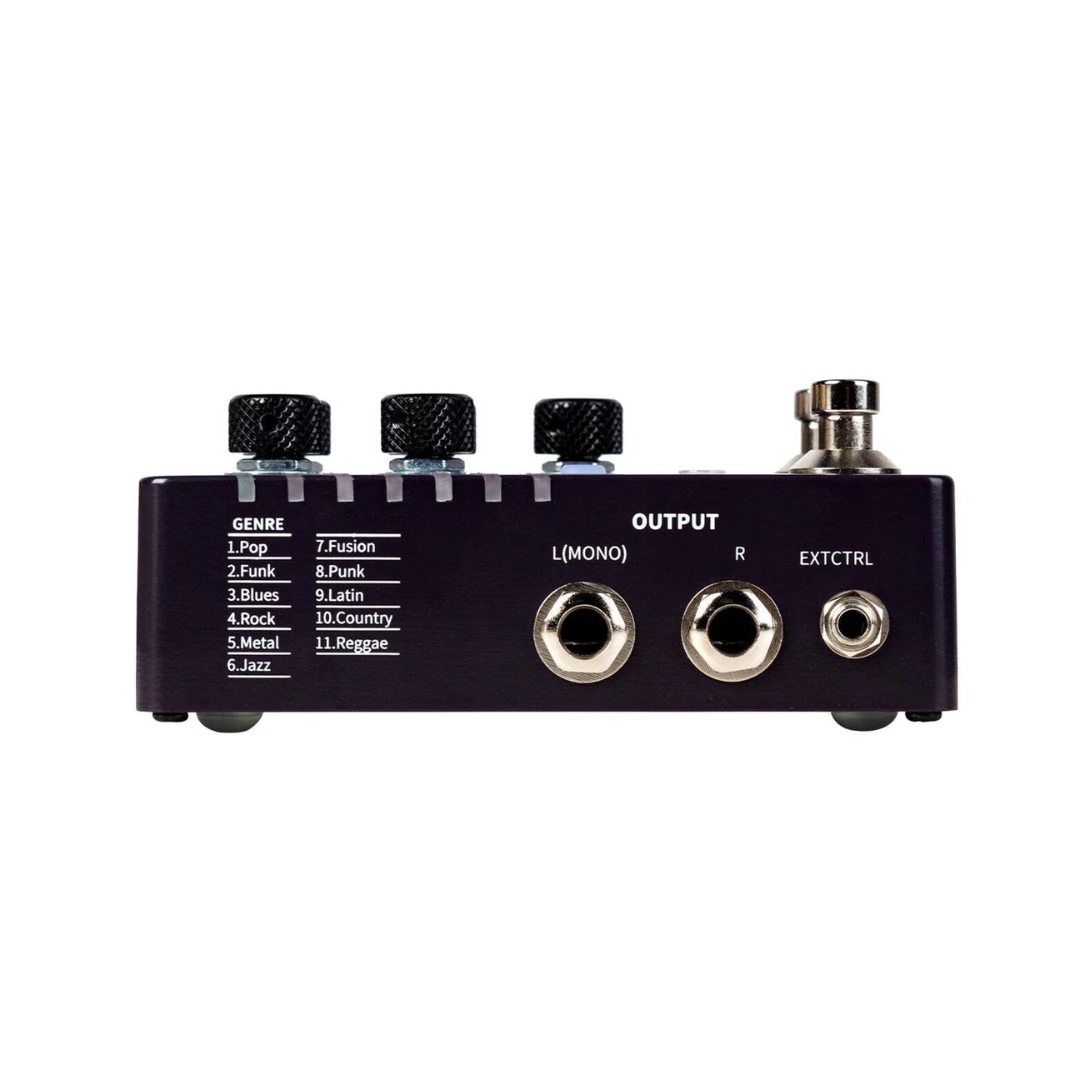 The Drummer X2 let guitarists employ the popular drum grooves from 11 different genres of music, with 11 different groove variations from each genre. Favorite grooves and tempos can easily be saved in one of the 11 song banks, each with 7 customized rhythm slots so they can quickly be recalled later. For fast cycling through presets, the Drummer X2 also supports external footswitches. In addition to the SPEED, GENRE, LEVEL, and PATTERN knobs, the Drummer X2 also boasts an EQ knob for making quick adjustments on the fly and for increasing compatibility with FRFR and non-FRFR devices. Timing can also alternatively be adjusted by utilizing the TAP TEMPO function with the right footswitch or external footswitch.
